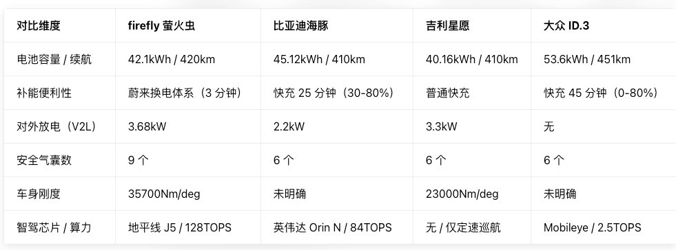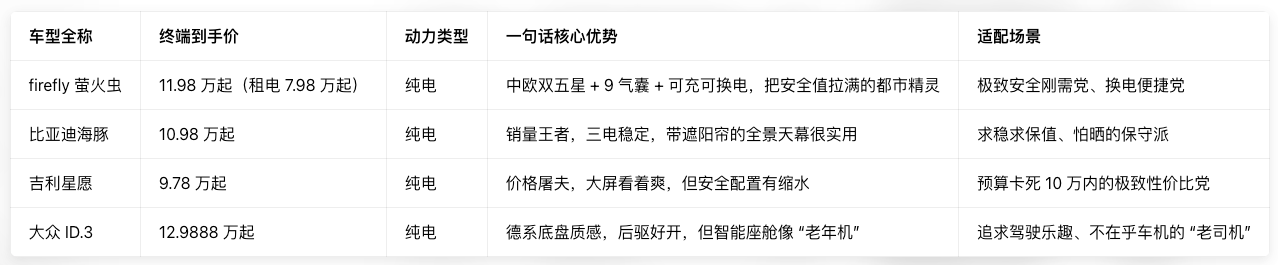 谁最省钱? 短期看是吉利星愿(车价最低),长期看是firefly萤火虫。因为支持换电,电池损耗风险被“蔚来”兜底了,而且BaaS方案直接把购车门槛拉到7.98万,相当于省下4万块去理财,这账算下来很精明。